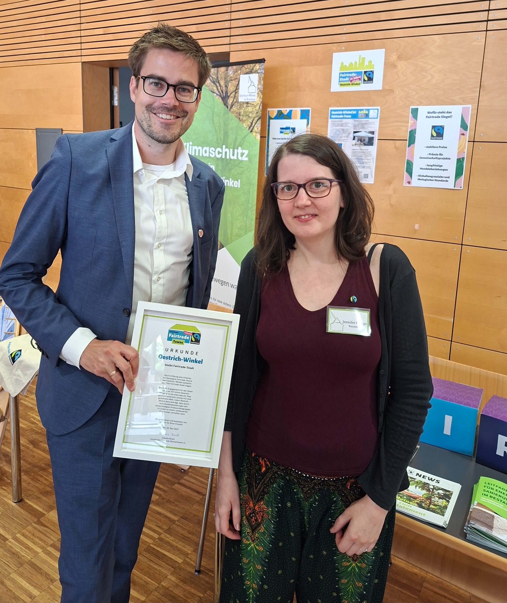 Bürgermeister Carsten Sinß und die Klimamanagerin der Stadt Oestrich-Winkel, Jennifer Höltge, freuen sich über die Rezertifizierung Oestrich-Winkels als Fairtrade Stadt.